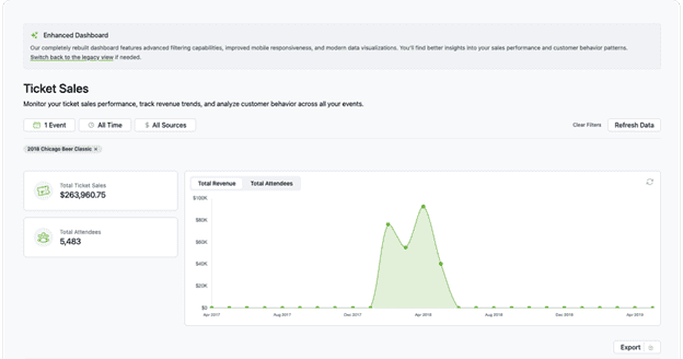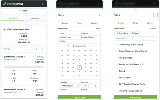 We've been working to refresh the EventSprout dashboard to make reporting clearer, faster, and more mobile-friendly—while keeping the experience familiar. Updates include a modernized design, improved filtering, enhanced ticket data with aggregation, and a redesigned mobile view.